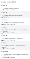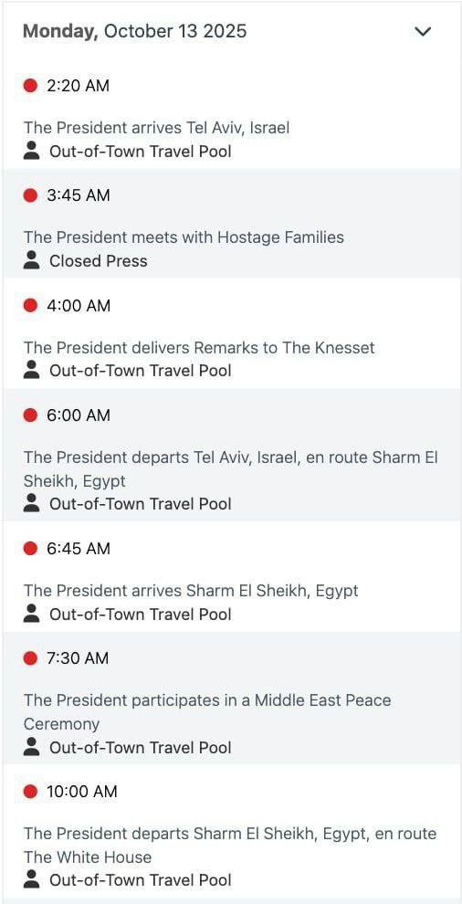Утром президент США прилетит в Израиль, где встретится с родственниками заложников и выступит в Кнессете. Далее он улетает в Египет, где пройдёт саммит по мирному урегулированию.