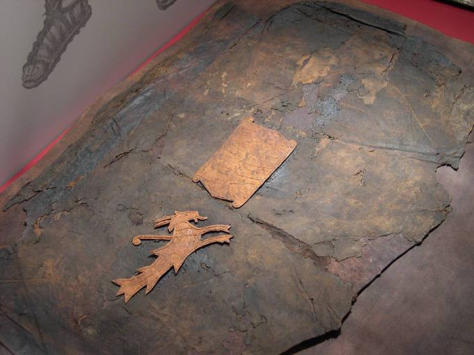 Фрагменты металлических полос на фронтальной части скутума. Возможно, принадлежит Тридцатому легиону Ульпия. Музей г. Лейдена, Нидерланды.