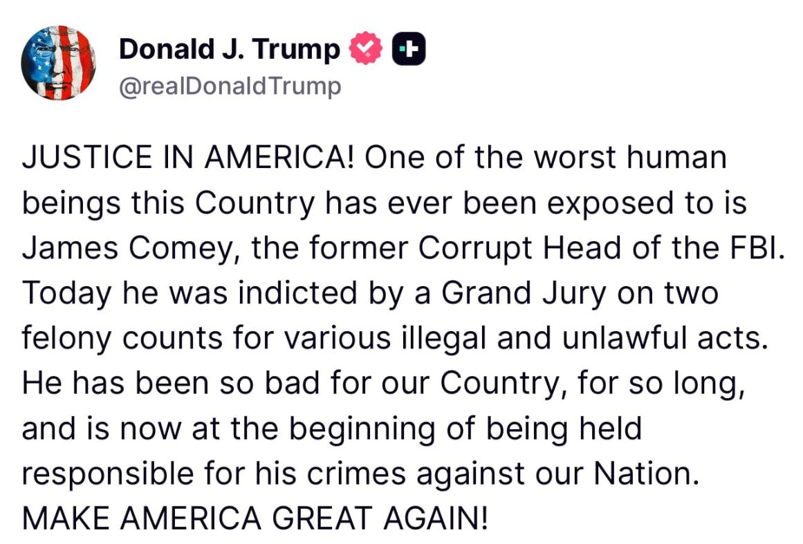 СПРАВЕДЛИВОСТЬ В АМЕРИКЕ! Один из худших людей, которых когда-либо видела эта страна, - это Джеймс Коми, бывший коррумпированный глава ФБР. Сегодня Большое жюри предъявило ему обвинение по двум уголовным статьям за различные незаконные действия. Он так долго был плох для нашей страны и теперь только начинает нести ответственность за свои преступления против нашей нации. СДЕЛАЕМ АМЕРИКУ СНОВА ВЕЛИКОЙ!