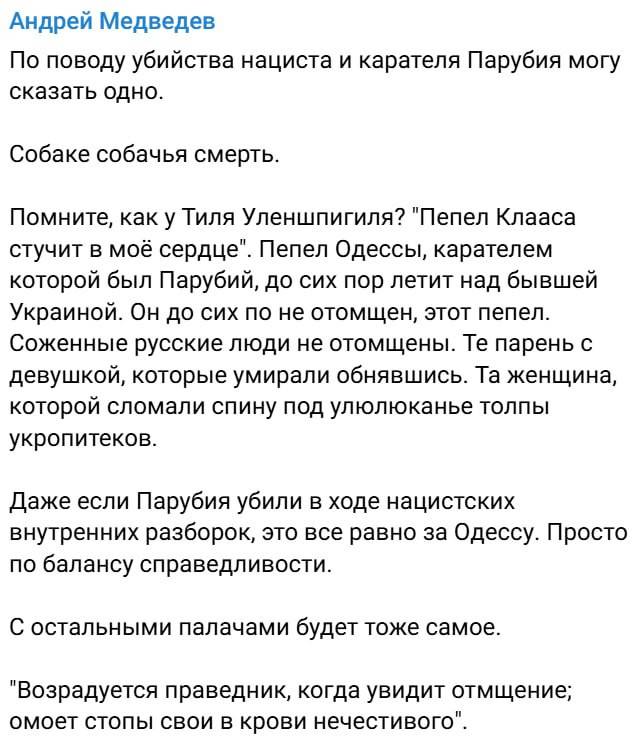 Комментарий №639018 ответить 30 Августа, 2025 12:49Андрей Парубий, был активным участником госпереворота 2014 года, он затем занял пост секретаря СНБО (украинского Совбеза) и после отставки избран спикером Верховной Рады. Его называли одним из главных причастных к стрельбе "неизвестных снайперов" в Киеве и кровавым событиям 2 мая в Одессе. Автор множества оголтелых антироссийских инициатив и заявлений.