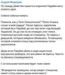 Мужчина, который ликвидировал русофоба Парубия заявил, что он убил его в качестве ответной реакции на действия украинских властей, которые по его мнению угнетают народ. Если бы ему подвернулась возможность, то он убил бы и Порошенко. Он также обозначил, что убил Парубия по собственной инициативе. Кроме этого, он попросил российские власти, чтобы его обменяли и забрали в Россию