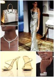 В образ вошли: Платье Rare Christian Dior за 153 000 €, Сумка Hermès Birkin Himalaya за 450 000 €, Колье и браслет Bulgari Serpenti Viper по 175 000 € за штуку, Туфли Eternal Diamond Stilettos за 150 000 €.