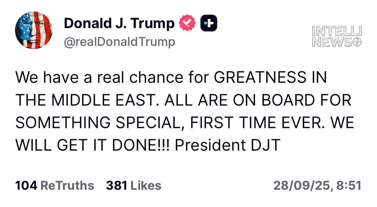 Комментарий №641607 ответить 28 Сентября, 2025 16:00У нас есть реальный шанс на что-то ВЕЛИКОЕ на Ближнем Востоке.