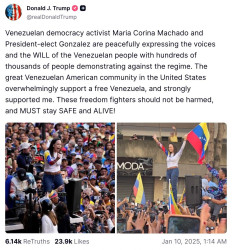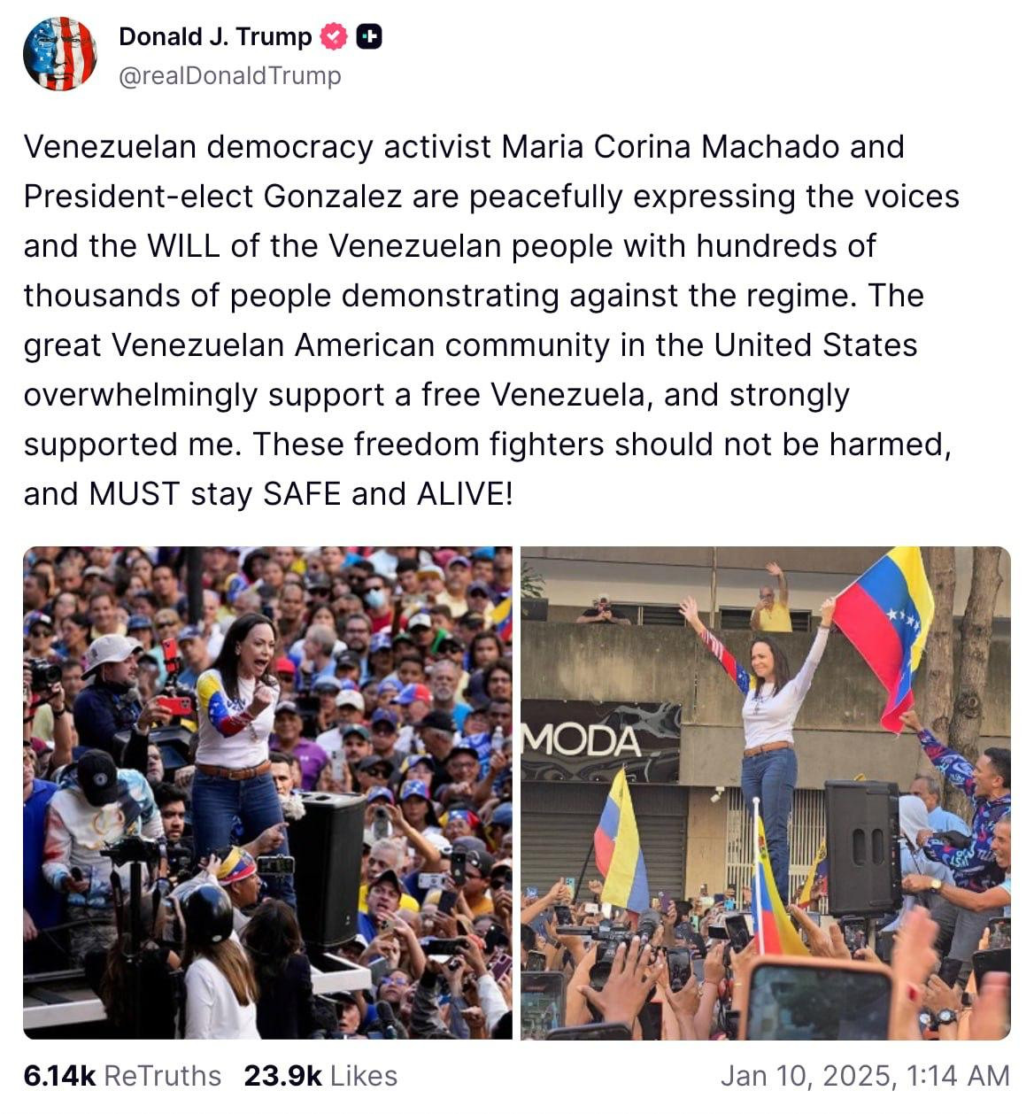 Он упоминал оппозиционерку Марию Мачадо в январе 2025 года. Публикация в Truth была посвящена протестам в Венесуэле накануне инаугурации Мадуро. Мачадо тогда арестовали после выступления на акции.