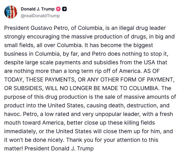 Комментарий №643646 ответить 19 Октября, 2025 16:21Президент Густаво Петро, из Колумбии, является лидером незаконной наркоторговли, активно поощряющим массовое производство наркотиков на больших и малых полях по всей Колумбии. Это стало крупнейшим бизнесом в Колумбии, и Петро ничего не делает, чтобы остановить это, несмотря на крупные выплаты и субсидии из США, которые являются не чем иным, как долгосрочным обманом Америки. С СЕГОДНЯ, ЭТИ ВЫПЛАТЫ, ИЛИ ЛЮБАЯ ДРУГАЯ ФОРМА ПОМОЩИ, ИЛИ СУБСИДИИ, БОЛЬШЕ НЕ БУДУТ ПРЕДОСТАВЛЯТЬСЯ КОЛУМБИИ. Целью этого производства наркотиков является сбыт огромных объемов продукции в Соединенные Штаты, что вызывает смерть, разрушение и хаос. Петро, низко оцененный и очень непопулярный лидер, с новым шагом в сторону Америки, лучше немедленно закроет эти убийственные поля, иначе Соединенные Штаты закроют их за него, и это не будет сделано мягко. Спасибо за внимание к этому вопросу, президент Дональд Дж. Трамп.