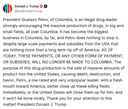 Трамп обвинил президента Колумбии в незаконном обороте наркотиков: